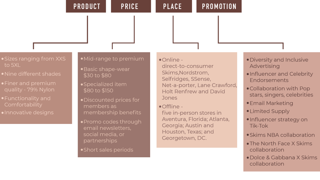 What truly sets the Skims apart is its commitment to inclusivity, offering shapewear and loungewear that caters to a wide range of body types, sizes, and skin tones. The brand offers products in more than ten skin tones (from “sand” to “onyx”). Their tagline “Solutions for every body” says it all. The brand holds sizes from XXS to 5X . Here is the 4 Ps breakout of the brand-